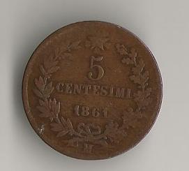 ITALY FIVE CENTS 1861M WORN