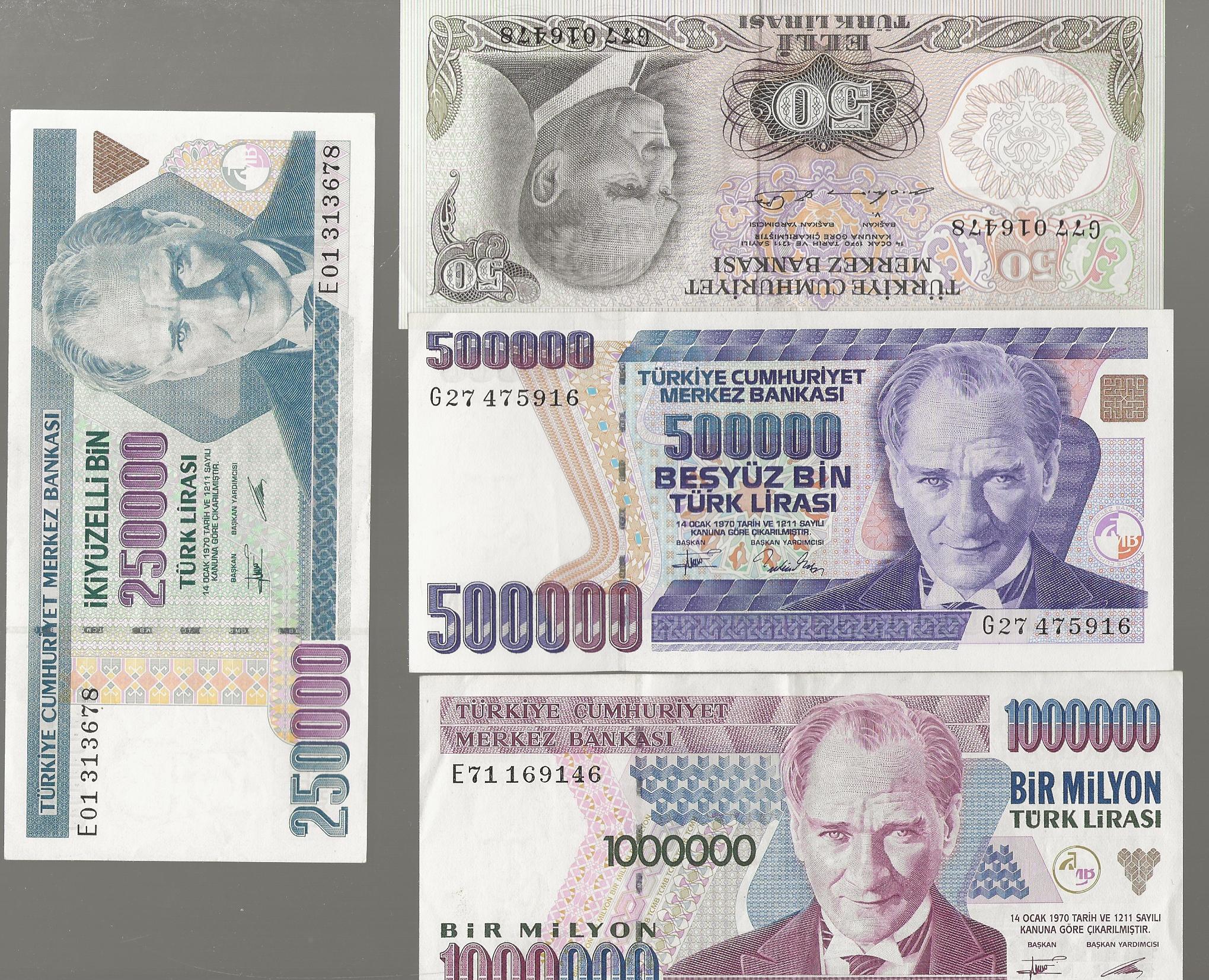 TURKEY BANKNOTES X 4 Year: 0Condition: CRISP AND CLEAN ALL HAVE VERY LIGHT FOLDS BUT THE 1000000 IS MORE PRONOUNCED SKU: 35302Price: £3.00£3.00