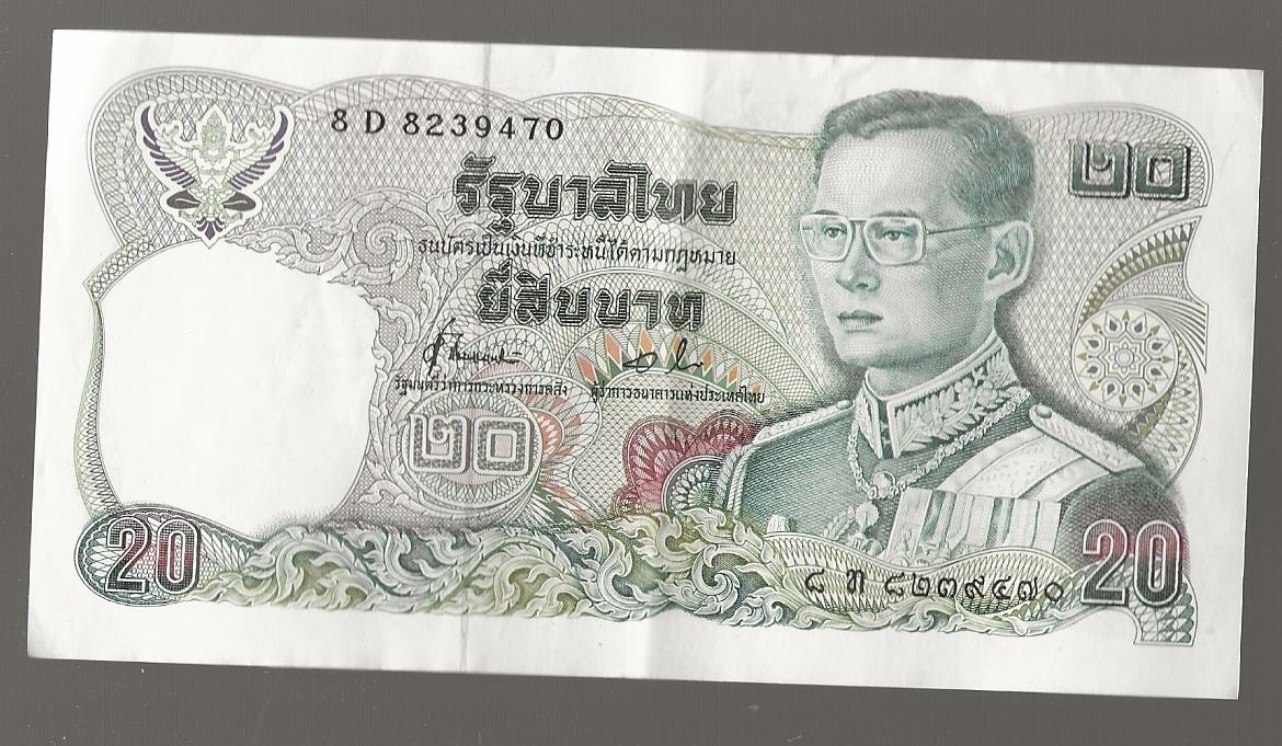 THAILAND TWENTY BAHT NICE CIRC Year: 0Condition: NICE CIRCULATEDHAS A CENTRE FOLD AND CREASES SKU: 35342Price: £0.50£0.50