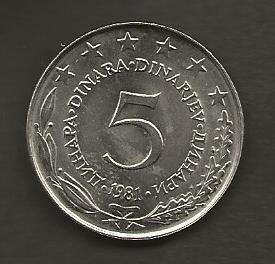 YUGOSLAVIA FIVE DINAR 1981 FINEPLUS