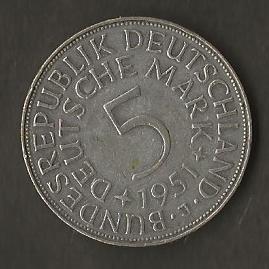 GERMAN SILVER FIVE MARKS 1951J CIRC Year: 1951Condition: CIRCULATEDJ MINTMARK SKU: 36195Price: £12.50£12.50